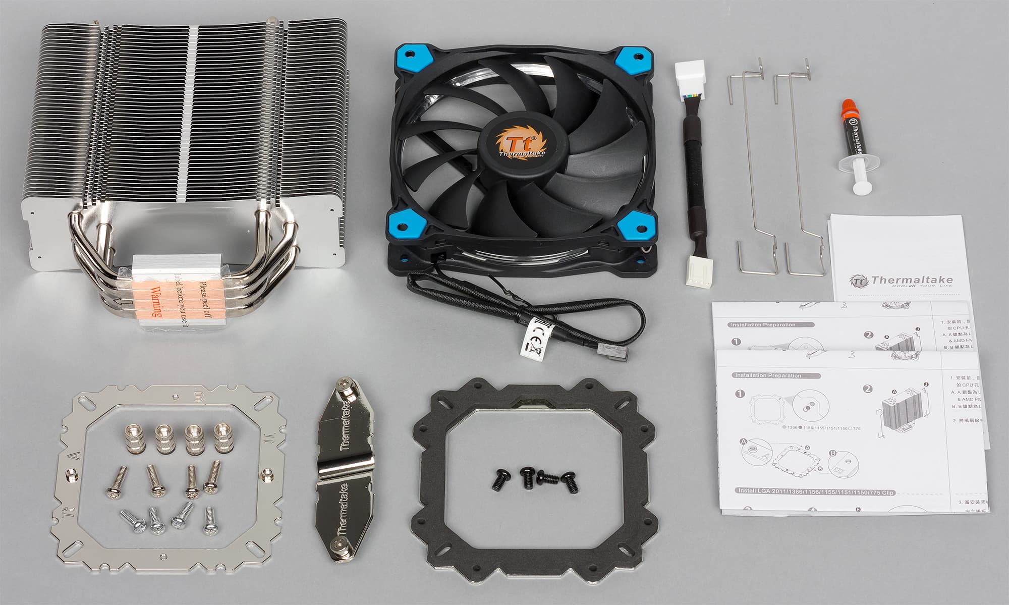 Радиатор в коробке сверху и снизу защищен вставками из вспененного полиэтилена, а спереди и сзади — вентилятором и коробкой с крепежом. Внимательные читатели могут заметить несоответствие изображенного на коробке вентилятора (и названия модели) тому, что приведено на фотографии выше. Невнимательных попросим обратить внимание на цвет вставок вентилятора. Да, к сожалению, нам достался вентилятор с голубыми вставками и синей подсветкой. Видимо, когда для нас готовили этот предпродажный экземпляр, случайно перепутали, и вложили вентилятор от варианта Riing Silent 12 Blue. Ну да ладно, все равно ничем, кроме цвета этих элементов кулеры не различаются. Инструкций по установке две, одна для процессоров AMD, вторая для Intel. Описание этапов понятное (есть русский вариант текста), хотя для монтажа кулера все равно требуется некоторая аккуратность. На сайте компании есть полное описание кулера (на русском языке), там же можно найти ссылку на PDF-файлы с инструкциями по установке.