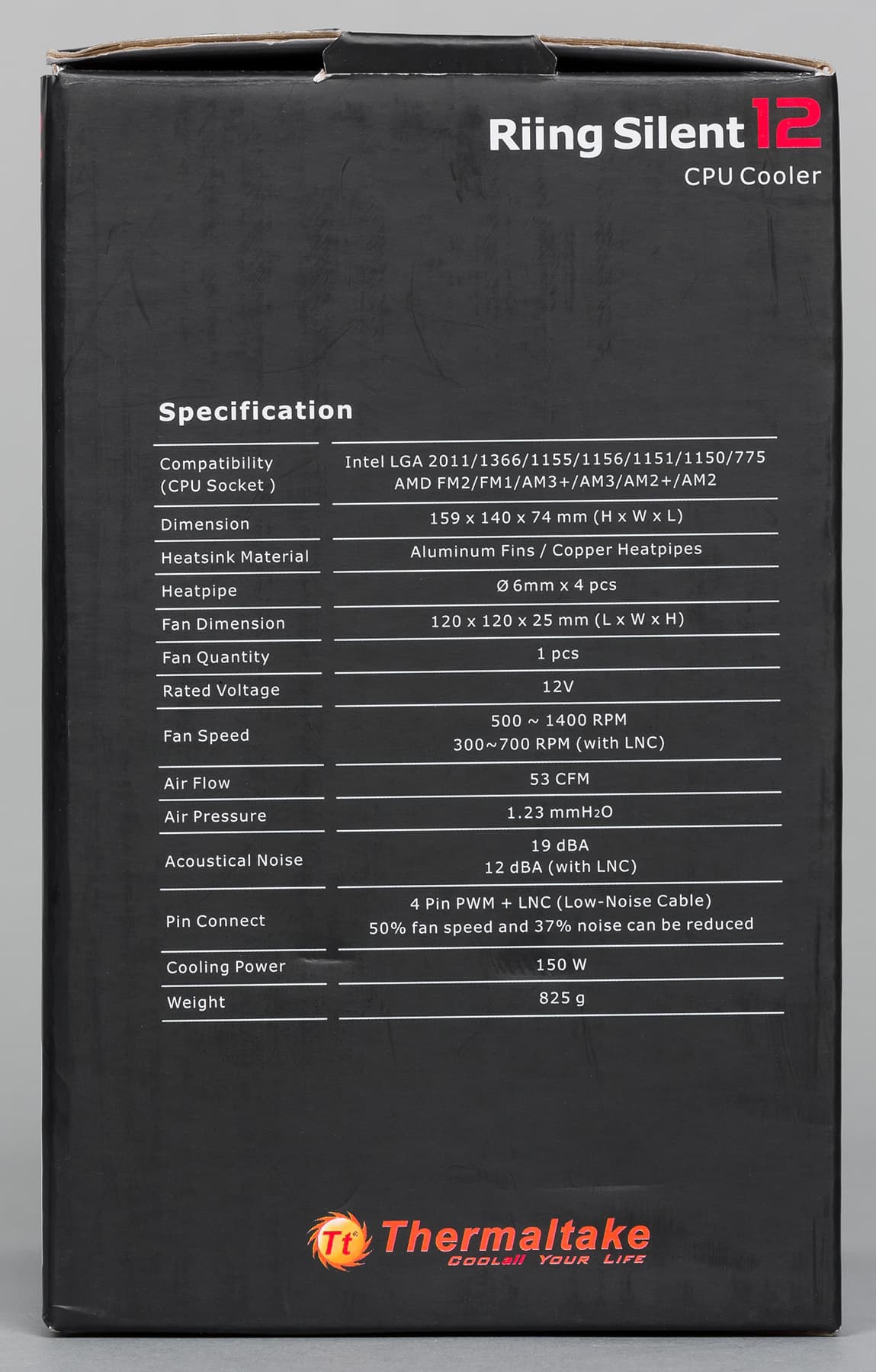 Поставляется процессорный охладитель Thermaltake Riing Silent 12 в строго оформленной картонной коробке.