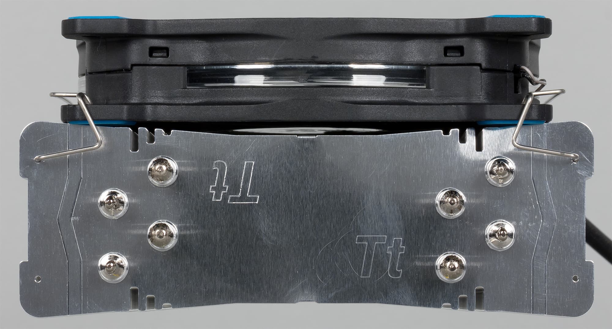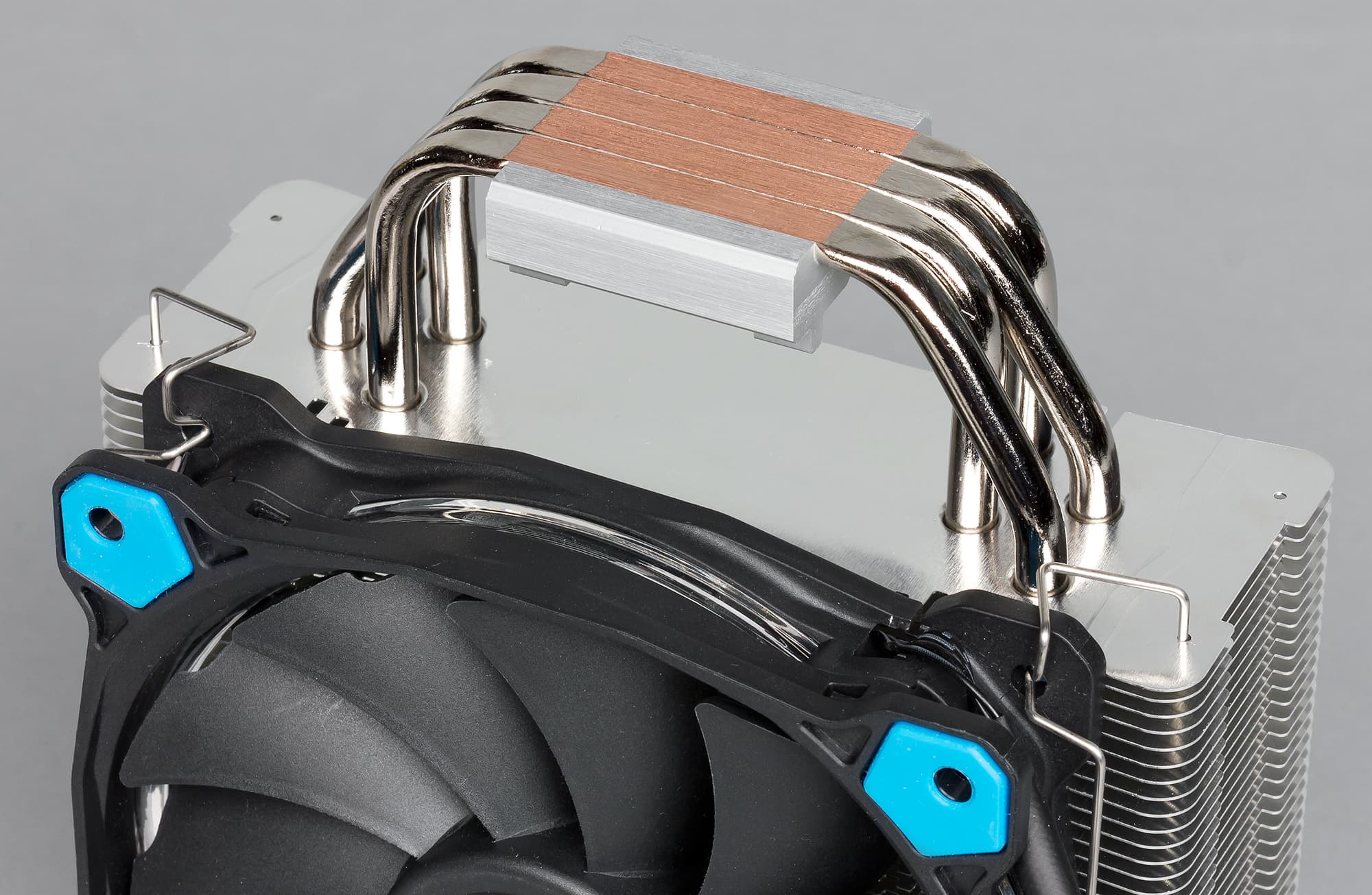 Кулер оснащен вынесенным радиатором, к которому тепло от подошвы передается по четырем тепловым трубкам. Трубки медные, и снаружи, видимо, никелированные. У подошвы теплосъемника трубки сплющены и впрессованы в толстую алюминиевую пластину, снаружи анодированную. Прилегающая к процессору плоскость теплосъемника сошлифована до равномерного обнажения меди на трубках. Тем самым достигается лучшая передача тепла непосредственно к трубкам и теплоносителю в них. Получившаяся поверхность ровная, но не отполирована до зеркального блеска. До установки подошва защищена пластиковой пленкой.