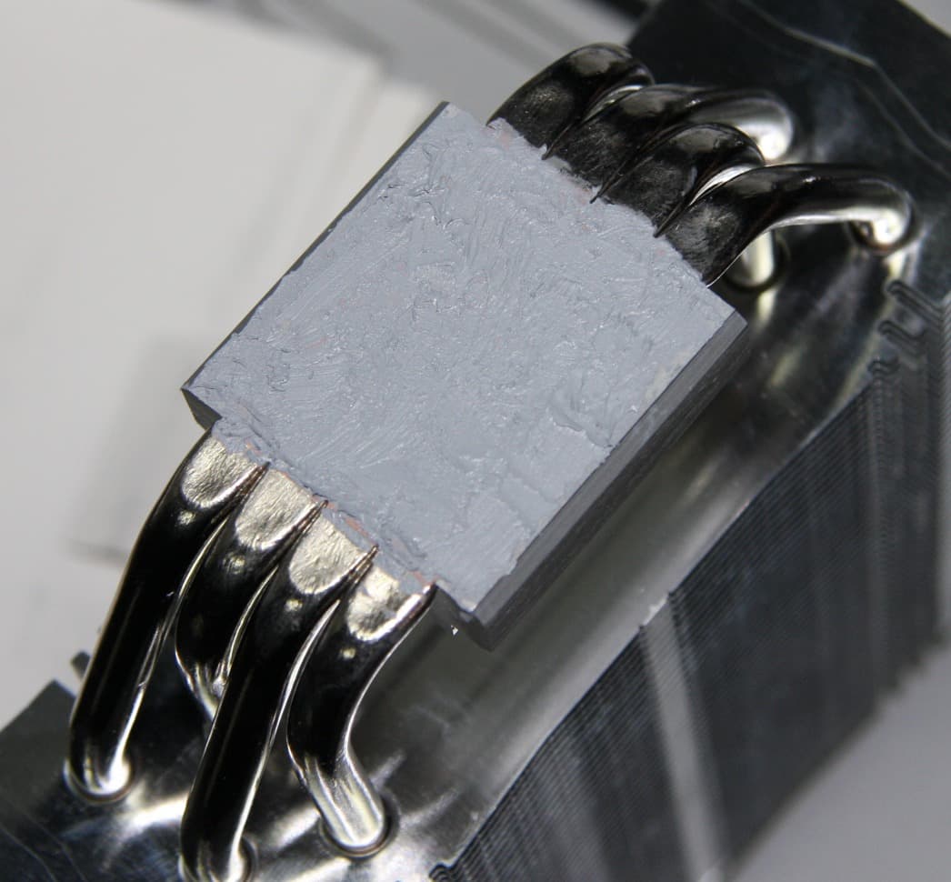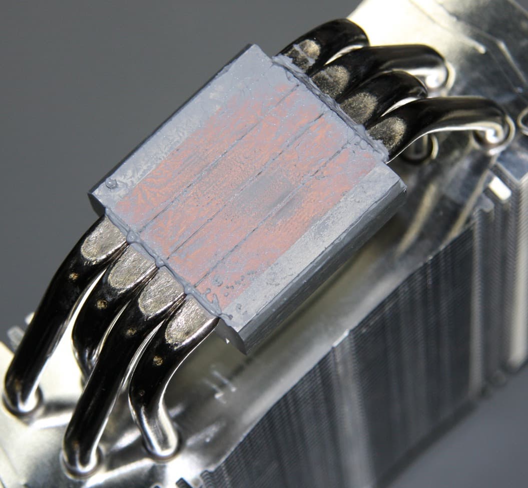 Рабочая плоскость теплосъемника чуть-чуть закруглена к выходам трубок, и еще меньше к двум другим граням, в итоге в центре теплосъемника образуется выпуклость с высотой в доли миллиметра (по нашим оценкам не более 0,1-0,2 мм). В продвинутых кругах считается, что небольшая выпуклость в центре улучшает прижим к центральной части крышки процессора, под которой собственно и находится кристалл, то есть является достоинством конструкции. При движении ногтя поперек трубок на подошве между трубками ощущаются неглубокие ложбинки. Трубок четыре, поэтому одна ложбинка проходит по центру, то есть над кристаллом, что в теории может немного ухудшать теплоотвод. Впрочем, это уже скорее придирки. Алюминиевая пластина теплосъемника квадратная — 38×38 мм, а ее плоская часть немного сужена за счет боковых проточек и имеет размеры 35×38 мм. Преднанесенного термоинтерфейса нет, но производитель приложил к кулеру небольшой шприц с термопастой. Для заведомо хорошего распределения мы нанесли чуть избыточный слой термопасты.