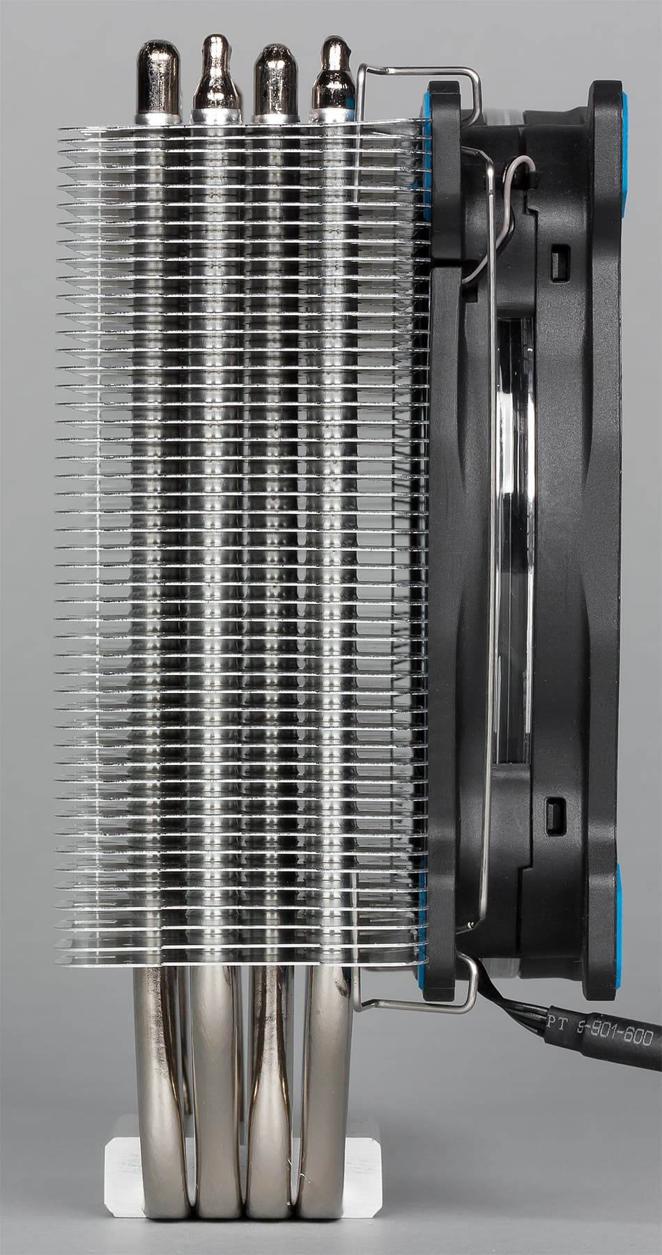 | Материал радиатора | Пластины из алюминия (0,4 мм толщиной с промежутком 2,2 мм) и медные тепловые трубки (∅6 мм×4 шт., прямой контакт с ЦПУ) |