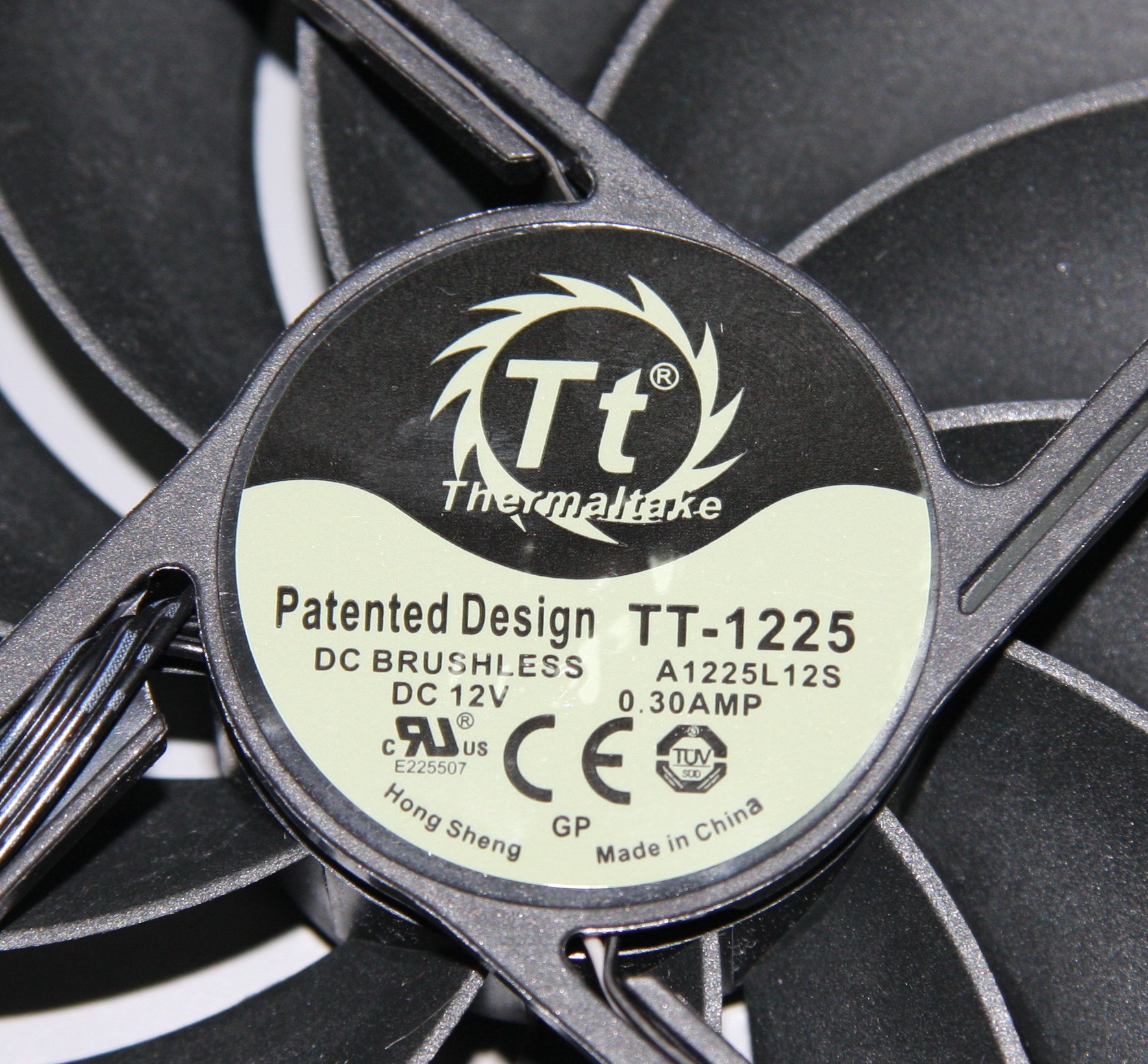 120 мм — это типоразмер комплектного вентилятора, а также внешние габариты его рамки. Высота рамки 25 мм. В отверстия в углах рамки вентилятора вставлены виброизолирующие втулки из упругого пластика средней жесткости и в данном случае ярко-голубого цвета. В несжатом состоянии высота этих втулок равна 26 мм, то есть выступают они всего на 0,5 мм. Это не создавало бы проблем, будь поверхность, к которой крепится вентилятор плоской, но из-за сужающихся пластин радиатора даже при использовании штатных и очень нежных скобок внешние края рамки вентилятора уже почти касаются радиатора, а если чуть сдвинуть вентилятор, то касаются. Поэтому нужно внимательно следить за правильностью установки вентилятора, чтобы невзначай не увеличить шум от передачи вибрации на радиатор. Маркировка на вентиляторе позволяет определить, что используется модель TT-1225 компании Hong Sheng.