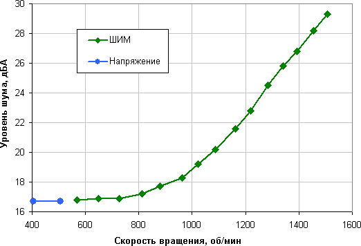 Полное описание методики тестирования приведено в соответствующей статье «Методика тестирования кулеров», а в этом разделе мы лишь уточним некоторые моменты. Использовалась нанесенная на поверхность теплосъемника термопаста из комплекта поставки. Работа вентилятора регулировалась с помощью изменения напряжения питания (от 12 В и ниже) или с помощью ШИМ при неизменном напряжении питания (12 В).