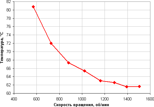 В этом тесте наш процессор с TDP 130 Вт не перегревается даже на минимальных оборотах вентилятора при регулировке с помощью ШИМ (и без использования LNC). И только снижение скорости вращения до примерно 500 об/мин вызывало отключение стенда из-за перегрева процессора. Для устранения влияния колебания температуры в тестовом помещении параллельно с замерами температуры процессора мы регистрировали температуру воздуха на расстоянии примерно 5 см перед центром вентилятора кулера (напомним, что стенд дополнительно обдувался бытовым вентилятором, что исключало зоны с локальной вариацией температуры). Для восьми замеров мы получили следующую картину: