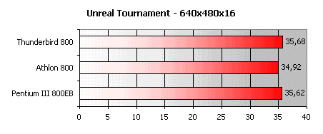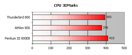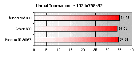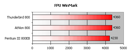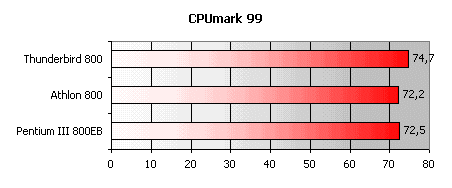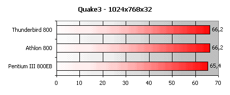 Различия в скоростях минимальны. Thunderbird опережает Pentium III всего на 1%, а старый Athlon — на 2%. Наверняка, в этом тесте можно добиться и другого расклада, если поменять, например, системные платы.