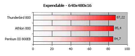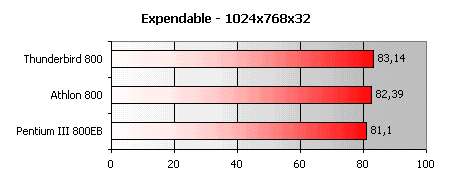 Expendable — игра, производящая во время своей работы интенсивные операции с большими объемами данных. Поэтому в данном случае сильно сказывается высокая пропускная способность процессорной шины EV6, которой обладают процессоры от AMD. Ну и, конечно, скоростной L2 кеш Thunderbird позволяет ему слегка обогнать старый Athlon.