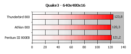 Производительность в низких разрешениях в Quake3 зависит от многих причин, поэтому данный тест хорошо показывает средневзвешенную скорость процессоров. Правда, особого повода для обсуждения он сейчас не дает — все показатели разных CPU близки друг к другу. Тем не менее, Thunderbird чуть-чуть вырвался вперед.