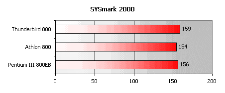 Этот тест также использует офисные приложения для измерения производительности. Однако же, состав задач, входящих в SYSmark 2000 таков, что процессоры от Intel традиционно показывали в нем более высокие результаты. Причины две — лучшая поддержка SSE приложениями этого теста и лучшая реализация в процессорах от Intel работы с L2 кешем. Однако, теперь ситуация изменилась и новый Athlon вышел вперед, обогнав Pentium III, работающий на той же частоте на 3 пункта.