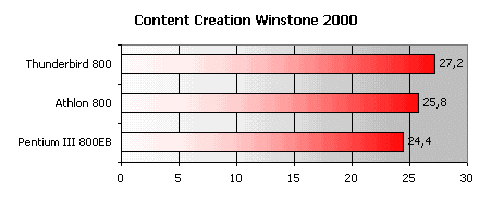 Переходим к тестам, основанным на реальных приложениях. По данным Content Creation Winstone 2000 процессоры AMD несколько опережают своих соперников от Intel. Однако, если сравнить скорости старого и нового Athlon, то разница в их производительности составляет всего 5%.