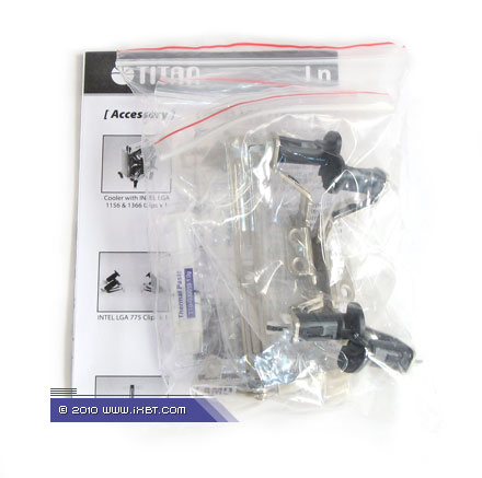 Поставка включает собственно сам кулер, дополнительные установочные приспособления (штатный крепеж поддерживает все актуальные платформы — Intel LGA775/LGA1156/LGA1366 и AMD Socket AM2/AM3), фирменную термопасту TTG-G30010 и краткое техническое руководство (присутствует русскоязычная инструкция).