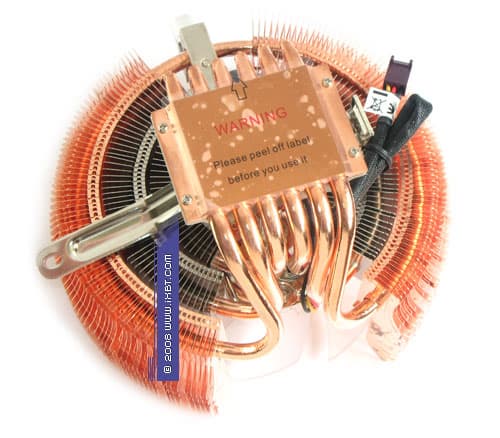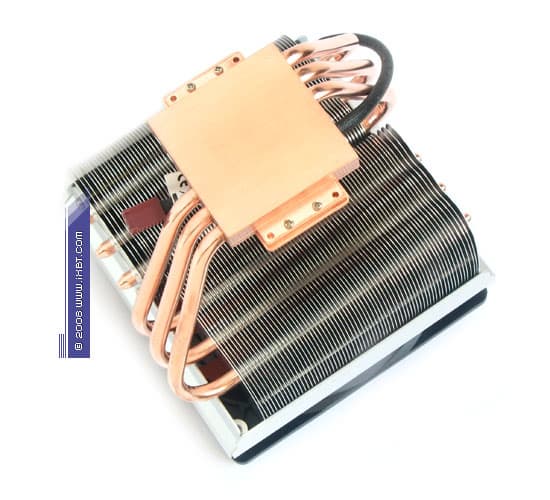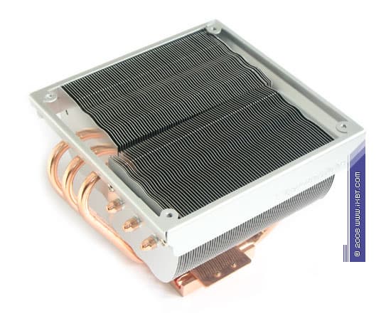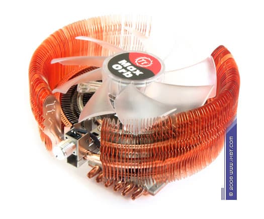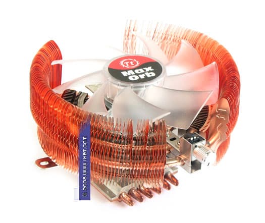 MaxOrb EX проявляет аккуратность и во внутренней детализации: все сопряжения тепловых трубок, и с теплосъемником, и с пластинами оребрения у нашего подопытного произведены честной пайкой. Правила хорошего тона, как и в случае с «родителем» — MaxOrb, соблюдены, что гарантирует комфортные условия теплообмена (в особенности по линии «трубки-оребрение») и, следовательно, способствует усилению эффективности всей термической структуры кулера в целом. Если же принять во внимание еще и медную начинку радиатора (потенциально более продуктивную), то важность этих двух обстоятельств трудно переоценить — определенно, у MaxOrb EX есть все задатки, чтобы проявить достойную результативность как в усиленных функциональных режимах (высокоскоростные обороты крыльчатки, интенсивный продув), так и в малошумном антураже (предельно низкие обороты крыльчатки, дефицитная вентиляция).