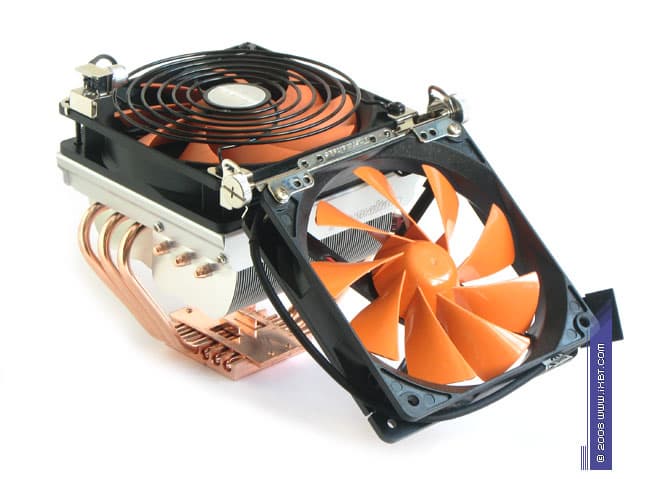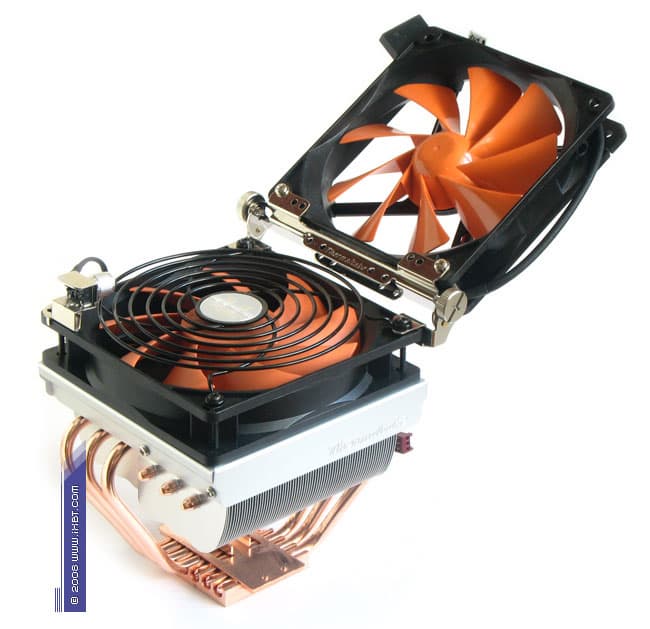 В чисто техническом ракурсе «новичок» BigTyp VP полностью повторяет конструктивное исполнение предшествующей модели BigTyp 120VX — кулер базируется на совершенно идентичном радиаторе (двухсекционное алюминиевое оребрение в горизонтальной ориентации, 6 медных тепловых трубок диаметра 6 мм, медный теплосъемник 50×50×9 мм) и оборудован абсолютно таким же вентилятором типоразмера 120×120×25 мм (модель Everflow F121225SM, номинальная скорость вращения крыльчатки 2000 об/мин). По идее, смену суффикса в наименовании следовало бы засчитать очередной маркетинговой премудростью и переадресовать читателя к родительскому продукту, если бы не одно интересное дополнение: новый представитель семейства BigTyp на поверку является не просто кулером, а двухсоставным комплексом «кулер плюс сопутствующий вентилятор», и как раз именно этому вентилятору (Satellite Fan, в терминах Thermaltake) он обязан своим существованием в лице выделенной модели BigTyp VP.