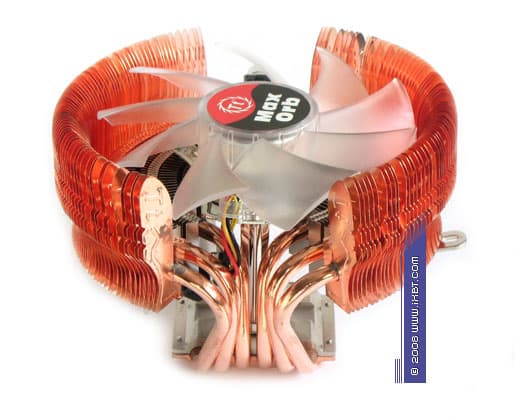 То есть, вновь наблюдаем крепкое и технически изящное «рабочее тело», которое наследует продуманную композицию в составе медного теплосъемника 60×40×12 мм (подошва 45×40 мм), 6 медных тепловых трубок диаметра 6 мм, комбинированного медно-алюминиевого оребрения («чашеобразной» конфигурация, эффективные габариты 140×54 мм) и открытой крыльчатки типоразмера 120×120×25 мм с номинальными оборотами 2000 об/мин. На своем исконном месте остается и генеральная достопримечательность MaxOrb — разделение оребрения на 6 независимых секций под индивидуальное обслуживание каждой тепловой трубки в конструктиве: 2 внутренние секции (30 пластинок 15×23 мм, алюминий), 2 «междоусобные» секции (55 пластинок 15×23 мм, алюминий) и 2 внешние секции (71 пластина усложненной формы, эффективные размеры 15×54 мм, медь).