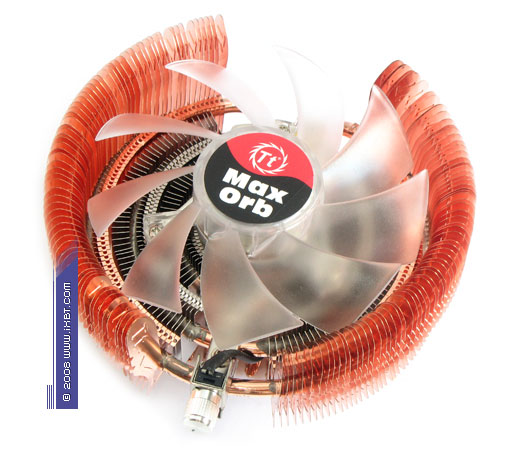 Впрочем, справедливости ради следует отметить, что в отличие от того же BigTyp VP все вопросы относительно технической корректности крепежа автоматически снимаются он хорошо согласуется с весовым параметром (масса MaxOrb EX составляет около 600 г) и обеспечивает надежную, строго нормативную посадку кулера. Другим оправдательным моментом можно засчитать специфический радиальный конструктив, который не допускает применения крепежных причиндалов, родственных эргономичным инсталляторам BigTyp VP. Однако, как ни крути, нынешнее компромиссное решение по-прежнему оставляет желать лучшего, и спецам Thermaltake здесь еще есть над чем поработать!