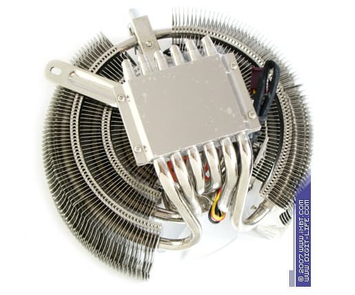 Нельзя обойти вниманием саму «чашеобразную» конфигурацию радиатора — такой подход не единожды доказывал свою жизнеспособность (вспомним хотя бы кулеры серии CNPS7000 и CNPS7700 от Zalman), более чем рационален он и в термическом имидже нашего подопытного MaxOrb. Даже не фокусируясь на мелких деталях, ясно видно, что «чаша» и «утопленный» в ней набортный вентилятор образуют аэродинамически пикантный, но в то же время, хорошо согласованный дуэт: сложные условия, в которых приходится работать вентилятору (по факту он функционирует в режиме пропеллера, с открытой крыльчаткой, и при всем желании не может «сгенерировать» достойное статическое давление потока), из недостатка тут обращаются в преимущество — выраженные турбулентные потоки на боковых кромках лопастей крыльчатки не только активно продувают внешние секции, но и дополнительно помогают «накачивать» внутренние секции оребрения, обеспечивая увеличенные коэффициенты теплоотдачи. Так что, получаем еще один конструктивный плюс в копилку MaxOrb.