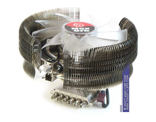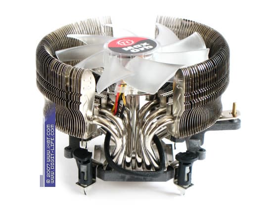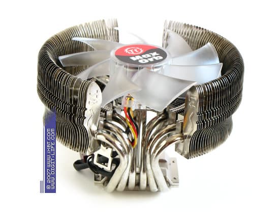 Другое важное обстоятельство — все сопряжения тепловых трубок, и с теплосъемником, и с пластинами оребрения в рабочем теле MaxOrb произведены честной пайкой. Заметный прогресс! Ведь даже формально более высококлассный V1 грешит упрощенным, «сухим» сопряжением трубок и оребрения, да и другие именитые кулеры Thermaltake, например, тот же Big Typhoon, с завидным упорством старались обходить этот момент. Теперь у нас есть все основания надеяться на улучшенный внутренний термоконтакт в облагороженном торсе MaxOrb и ожидать оптимизации полного термического сопротивления кулера.