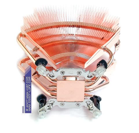 Единственный конструктивный грешок V1 — это способ сопряжения тепловых трубок и пластин оребрения: вместо пайки, которая так и просится в паре «медь-медь», термоконтакт трубок и пластин осуществляется простым термоклеем, что не есть хорошо согласно правилам технического этикета. Впрочем, сами сочленения трубки-пластины обжаты весьма и весьма плотно, да и по-настоящему критический контакт трубок и теплосъемника (подошвы) выполнен, как положено, пайкой. Так что, по большому счету, на этот грешок особого внимания можно не обращать, к тому же, судя по итоговой результативности V1, какого-то значимо негативного влияния на термическое сопротивление кулера он не оказывает.