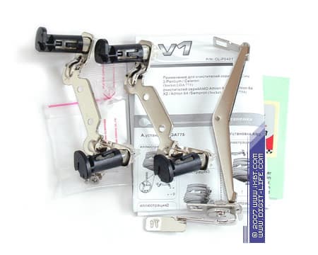 Действительно, по сравнению с теми же Silent Tower или Big Typhoon, процесс инсталляции V1 несравнимо облегчился. Теперь, чтобы провести установку на платформе Intel LGA775, не нужно вынимать материнскую плату из корпуса, возиться с монтажными крестовинами и наматывать по 8 гаек, усиленно манипулируя отверткой. Достаточно прикрутить к подошве две крепежных планки со стандартными, референсными замками-кембриками (push-pin clips), защелкнуть их в монтажных отверстиях сокета — все, V1 готов к труду и обороне! А в системах AMD инсталляция еще более упрощена, тут даже не придется брать в руки отвертку — для Socket 754/939/AM2 предусмотрена типовая крепежная клипса с поворотной ручкой-рычагом, фиксирующая кулер на двух зубцах монтажной рамки сокета. Явный прогресс!