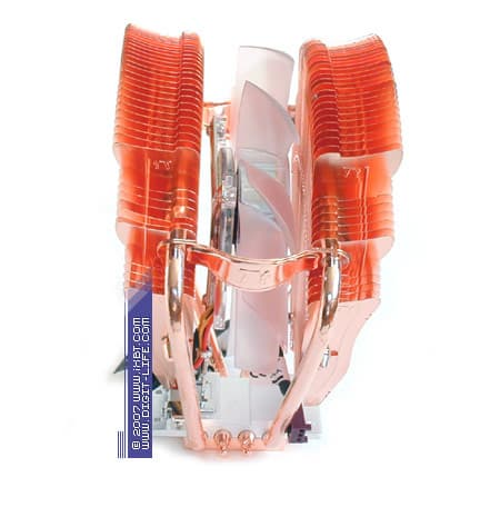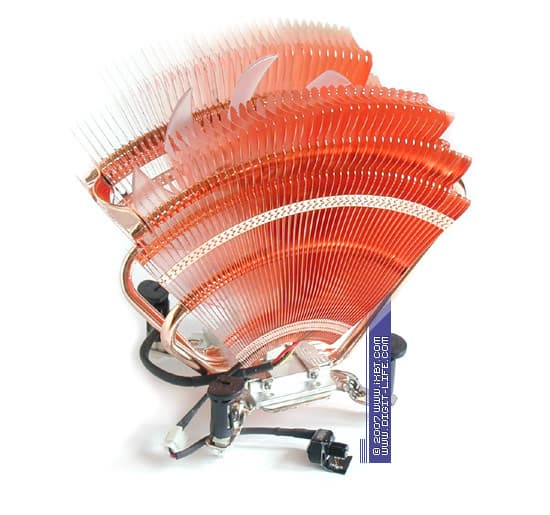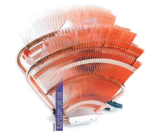 Отрадно, что, занимаясь темой дизайна V1, они не забыли проработать и чисто термические параметры кулера (по-видимому, не самый позитивный опыт с «игрушечной» моделью Beetle послужил для ребят из Thermaltake хорошим уроком): здесь мы наблюдаем «рабочее тело», образованное солидной комбинацией из медного двухсекционного оребрения, 4 медных тепловых трубок и медного теплосъемника 36х36х5 мм. Причем обе секции развернуты веером (контур которого похож на букву V) и каждая секция насчитывает 51 пластину толщиной 0,2 мм (их конфигурация, кстати, также является «V-образной» — ширина пластин в нижней части оребрения, ближе к подошве, составляет 8 мм, а в верхней части пластины расширяются до 28 мм). Несмотря на довольно компактные габариты оребрения (эффективные размеры 138х70х115 мм), общая площадь поверхности теплообмена у нашего подопытного развита до величины порядка 4300 см², вполне приличествующей хай-эндовым кулерам (по этому параметру V1 почти нагоняет известного удальца от Scythe — кулер Ninja, перекрывает Zalman CNPS9500 LED и CNPS9500 AM2).