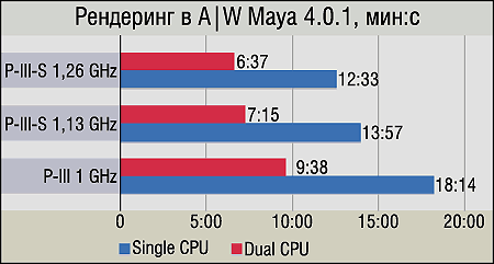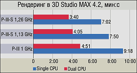 Несмотря на переход на обновленную версию, это приложение никаких сюрпризов не преподнесло: как и всегда, производительность при рендеринге существенно повышается при установке второго процессора, впрочем, и частота также дает стабильный прирост. Более интересно сравнивать графики одно- и двухпроцессорных систем между собой — четко видно, что прирост каждого следующего по мощности CPU по отношению к скорости предыдущего на системах с одним процессором ощутимо выше. Как нам кажется, в случае с двухпроцессорными системами производительность просто становится настолько высока, что дальнейший рост скорости обусловливается уже не частотой или количеством CPU, а подсистемой памяти и полосой пропускания процессорной шины. А эти параметры в дуальных системах на платформе Socket 370, к сожалению, "апгрейду" уже не поддаются. "КПД большого кэша" в случае 3DS MAX не очень высок — около 7%.