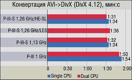 От свободно распространяемого мультиплатформенного кодека DivX 4.12 трудно было ожидать SMP-оптимизации — в мире freeware такое встречается редко. Поэтому рассматривать кодирование AVI-->DivX с точки зрения SMP мы не будем, а просто скажем, что польза от второго процессора практически нулевая. Более интересно то, что под это же определение ("практически нулевая польза") попадает не только увеличение количества CPU... но и увеличение частоты! Результаты P-III-S 1,13 GHz и 1,26 GHz, как легко заметить, почти идентичны. О возможной причине внимательные читатели уже, наверное, догадываются — скорее всего, узким местом становится не мощность вычислителя, а скорость поступления данных, т. е. работа с ОЗУ. К слову, превосходные результаты, которые почти во всех приложениях класса media-encoding показывает Pentium 4 с егодвухканальной RDRAM (3,2 GBps), косвенно подтверждают наши предположения. А вот большой кэш, как это часто бывает при медленной памяти, показал себя весьма неплохо — его "КПД" для DivX составляет порядка 20%.