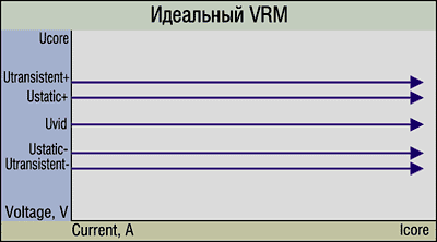 Для борьбы со всеми этими нежелательными явлениями и была разработана концепция нагрузочной прямой. Применявшийся ранее "идеальный VRM" при работе процессора поддерживает постоянное напряжение питания ядра в заданном диапазоне, несмотря на изменяющееся потребление тока (для P-III — от 0 до 30 A).