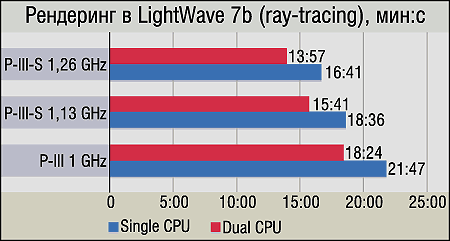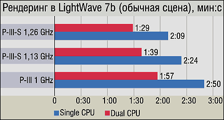 Мы приводим для LightWave две диаграммы, и это неспроста. Как оказалось в процессе отработки новой методики, влияние SMP на производительность может изменяться не только от приложения к приложению, но даже в зависимости от конкретной сцены, рендеринг которой оно осуществляет. Доказательства — налицо: при рендеринге стандартной тестовой сцены Radiosity_ReflectiveThings, не содержащей полупрозрачных объектов, прирост от использования SMP достигает 45%, т. е. почти двукратный. Однако при смене сцены на другую (Tracer-Radiosity) на той же системе ускорение от второго процессора равняется... всего 18%. Вывод очевиден: даже в рамках одной программы флуктуации производительности SMP-систем могут быть весьма велики. Что же касается результатов LightWave, то они очень похожи на результаты 3DS MAX, с той лишь поправкой, что польза от SMP в целом меньше, а в отдельных случаях — совсем небольшая.