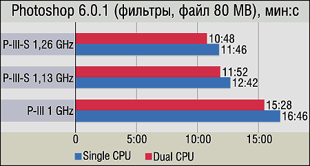 Новая методика тестирования в Photoshop 6.0.1, разработанная одним из наших читателей, теперь включает в себя три скрипта, отличающихся друг от друга не только временем исполнения, но и "концептуально". Первый скрипт создает файл среднего размера (порядка 40 MB) и работает с его содержимым, используя как фильтры, так и команды Photoshop. Второй применяет только фильтры к файлу относительно большого размера (80 MB), третий — опять-таки использует только фильтры, но размер файла составляет 20 MB. Под командами в данном контексте мы подразумеваем операции, не входящие в меню Filters, т. е. изменение размера изображения, вращение, операции с цветом, слоями и т. п. По результатам легко заметить два момента: то, какие операции в Photoshop лучше всего "заточены" под SMP (самый большой прирост наблюдается в первой диаграмме, т. е. в тесте, где кроме фильтров используются еще и команды), и то, насколько этому приложению "помогает" увеличение размера L2-кэша. По "КПД большого кэша", который составляет до 25%, Photoshop занимает первое место в этом тестировании. Кстати, в отличие от SMP, удвоенный L2-кэш лучше всего показал себя именно при работе с фильтрами.