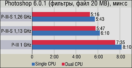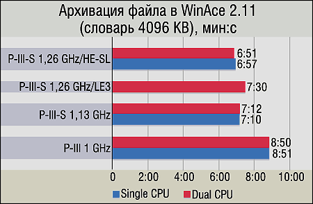 Архивирование с помощью WinAce с 4-мегабайтовым словарем и максимальной степенью сжатия является нашим традиционным "реальным" тестом на производительность подсистемы памяти. Однако в данном случае хорошо заметно, что на платформе Socket 370 эта подсистема просто не в состоянии обеспечить требуемой для данного приложения скорости. То преимущество, которое получили P-III-S 1,13 и 1,26 GHz, связано исключительно с тем, что 512-килобайтовый кэш позволил им немного "сгладить" недостатки "бутылочного горлышка" в лице шины памяти (это подтверждается тем, что их результаты практически одинаковы). Что же касается SMP, то четко видно, что WinAce не поддерживает многопоточность. Впрочем, это вполне естественно — все-таки архиваторы не относятся к группе приложений, где такой вид оптимизации широко распространен.