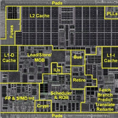 Форматированные команды поступают в 3-путный декодер, состоящий из микросеквенсора с микрокодом и трёх сложных трансляторов, каждый из которых может генерировать 1–3 мопа, в т. ч. «микрослитые» (у др. ЦП сложный транслятор лишь один, а у Атома — ноль). Микрокод имеет ПЗУ на 8192 тройки мопов и может быть обновлён однократно прожигаемыми перемычками (на схеме чипа — Fuses). Микросеквенсор имеет собственный механизм переходов (включая условные) и даже вызовов «подмикропрограмм» — эти команды исполняются прямо в нём, а не в исполнительной части.