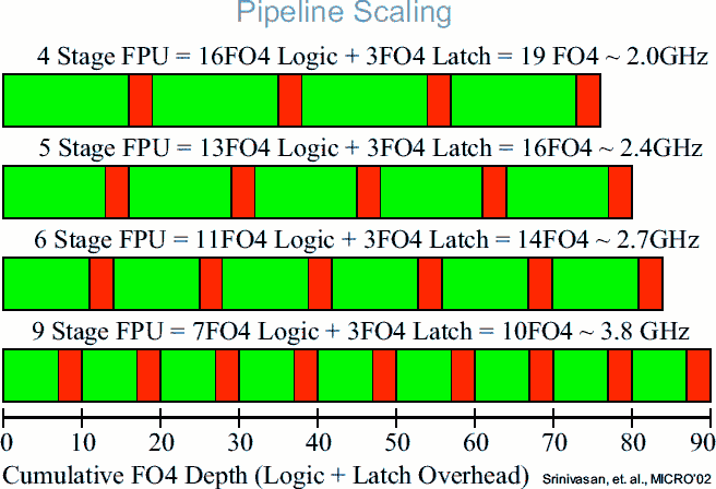 Сделанное IBM исследование производительности новейшего на тот момент (2002 г.) техпроцесса 180 нм показывает число логических вентилей (измеренное стандартной метрикой FO4), которые должны сработать в каждой стадии вещественного конвейерного ФУ (включая буферы), в зависимости от числа стадий — а также результирующую макс. частоту. 4-стадийный дизайн работает вдвое медленнее 9-стадийного, занимая на 15% меньше места. Теперь посмотрим на потребление: