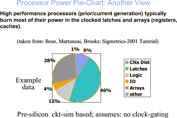 Тут всё куда хуже. Оказывается, в наиболее высокопроизводительных длинноконвейерных ЦП (типа IBM Power и Intel Pentium 4) почти половина мощности ядра уходит на буферы, срабатывающие каждый такт после каждой стадии, тогда как далеко не все транзисторы самих стадий работают в каждый момент даже при полной загрузке конвейера. Лишь 12% приходятся на логику, включая ФУ, и ещё 28% — на двухмерные регулярные структуры типа кэшей. Высокочастотная распределительная сеть также весьма прожорлива — 9%.