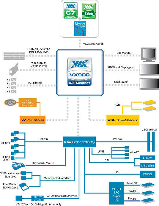 - Графическое ядро — VIA Chrome9 HC3 на 250 (166) МГц с поддержкой DirectX 9.0 и Pixel Shader 2.0, аппаратным декодированием MPEG-2/4, DivX и VC-1 при разрешении Full HD и с выходами VGA и LVDS;