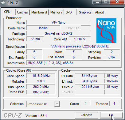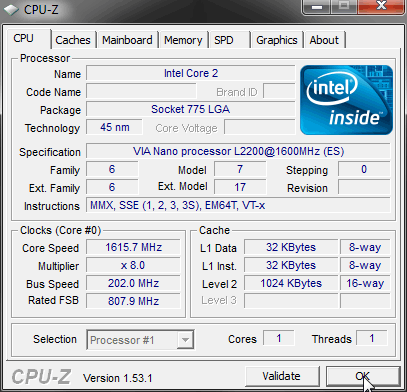 Итак, запустив для верности программу CPU-Z, мы увидим VIA Nano как он есть (на полной частоте):