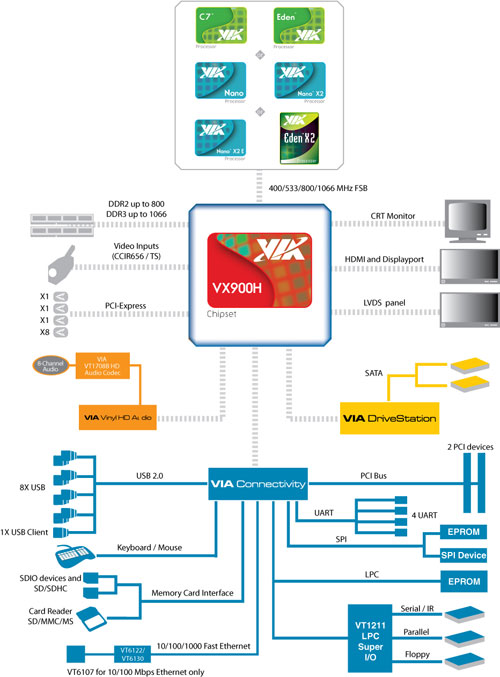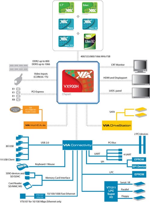 В своих платформах VIA давно использует двухчиповую компоновку — как и AMD с Intel. Правда, распределение функций между компонентами разное. У двух ведущих компаний все, что можно, в последние годы переехало под крышку процессора — GPU, контроллер памяти и контроллер PCIe. VIA же пришлось заняться интеграцией компонентов раньше, доступа к «тонким» нормам производства чипов у компании не было, так что единственным доступным путем было упрощение функций южного моста и его интеграция с северным. Пройдя через несколько промежуточных стадий, в конечном итоге это вылилось в чипсет VIA VX900H — модификацию VX900 двухлетней давности.