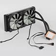 Радиатор в этой системе водяного охлаждения несколько отличается от тех, что мы видели ранее в других СВО. Он имеет габаритные размеры 278 × 124 × 27 мм, что несколько странно, так как в этой модели применяются 120-миллиметровые модели вентиляторов. Однако самой изюминкой является конструкция ячеек — здесь они выполнены в форме правильных прямоугольников. Предполагается что такая структура, в отличии от традиционной, должна повысить эффективность отвода тепла от радиатора. Вентиляторы крепятся к радиатору с помощью специальных винтов и полностью практически покрывают поверхность радиатора. При этом между радиатором и вентилятором имеется силиконовая прокладка, которая необходима для нейтрализации возможной вибрации, что позволяет в конечом итоге несколько снизить уровень шума.