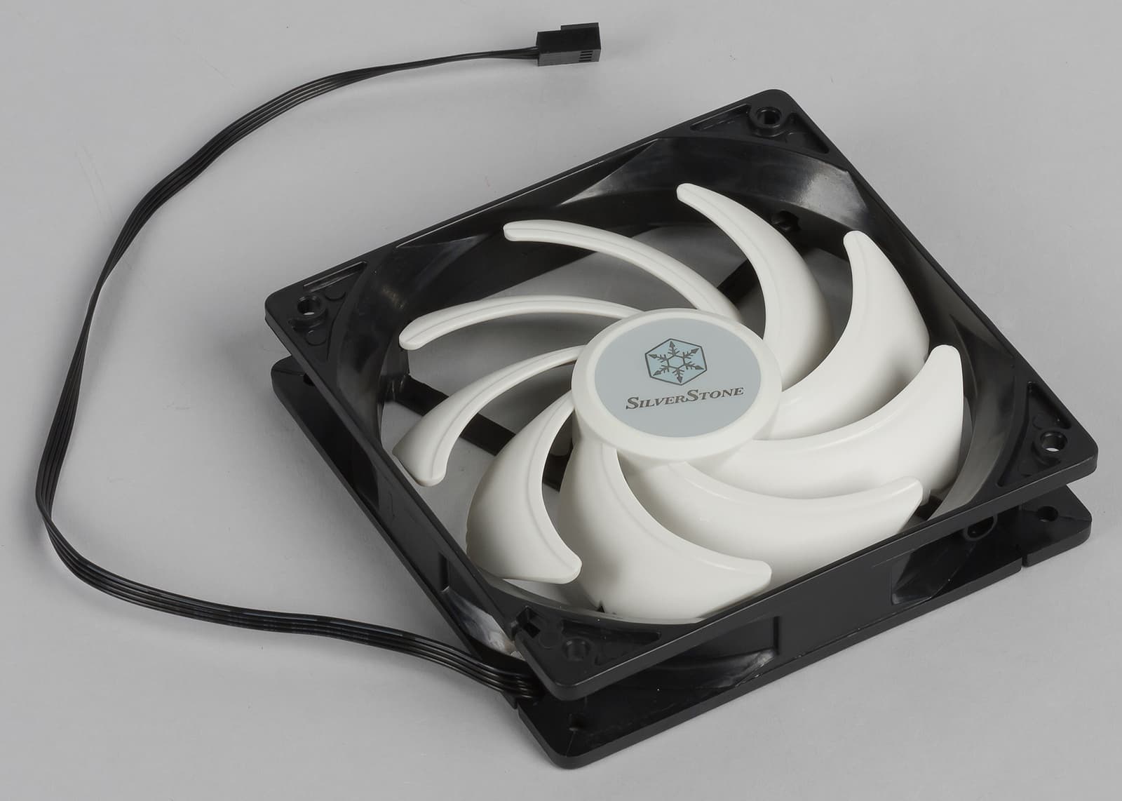 В комплекте с SilverStone Tundra TD02-E поставляются фирменные вентиляторы APA1225M12. К слову сказать, этот тип вентиляторов, но с другой крыльчаткой, был установлен в корпусных вентиляторах FW122, которые мы рассматривали в отдельной статье. Вентиляторы для SilverStone Tundra TD02-E имеют 9-лопастную крыльчатку несколько необычной формы — на каждой из лопастей с обратной тороны можно увидеть по три небольших насечки. Предполагается что такое строение позволяет получить большую эффективность при одинаковом уровне шума. На торцах вентиляторов имеются небольшие отверстия, расположенные ближе к одному краю. Отверстия необходимы для дополнительного забора воздуха, что позволяет получить прирост в производительности, а также внизить общий уровень шума, создаваемый при работе. Оба вентилятора имеют 4-контактный разъем для подключения к системной плате и поддерживают ШИМ-управление. Подключение к материнской плате осуществляется через специальный Y-разветвитель, который идет в комплекте.
