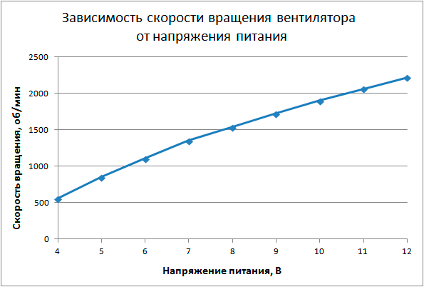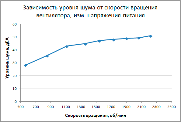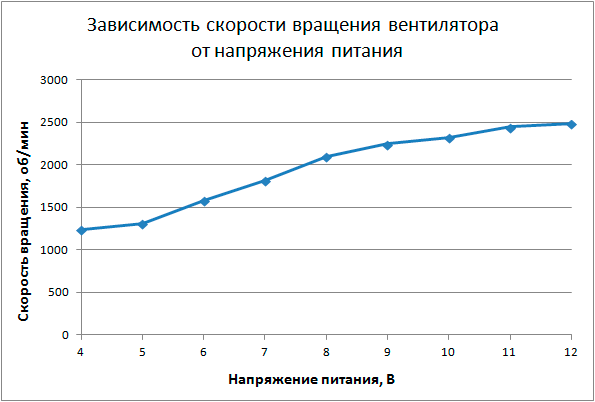 Скорость вращения вентиляторов этой модели лежит в широких пределах, при этом не важно, каким образом они управляются. Впрочем, управление с помощью динамического изменения напряжения питания, дает более широкий диапазон оборотов.