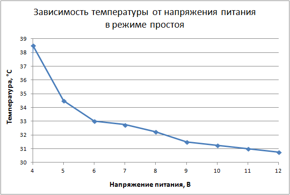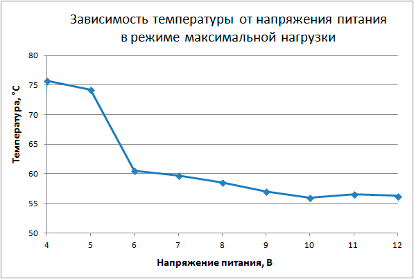 Управление кулером с помощью изменения напряжения питания позволяет получить более плавный график температуры, чем при использовании ШИМ-контроллера. При низком напряжении питания, из-за слишком низких оборотов вентилятора и небольшой площади рассеивания, данная модель кулера начинает испытывать трудности и склонность к перегреву.