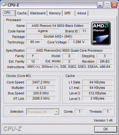 Однако, на самом деле, всё не так плохо, как кажется на первый взгляд. Не будем забывать, что в процессорах Intel архитектура кэша неэксклюзивная, таким образом, максимальный объём кэшируемой информации определяется кэшем наибольшего размера. А на платформе AMD кэш эксклюзивный (L3 — адаптивно-эксклюзивный, но при одном ядре он по идее должен вырождаться в просто эксклюзивный), таким образом, максимальный объём кэшируемой информации определяется суммой размеров кэшей всех уровней. В нашем случае она составляет 128 (L1) + 512 (L2) + 2048 (L3) = 2688 КБ. Конечно, даже эта цифра на 13% меньше, чем 3072 КБ L2 у Wolfdale, однако ввиду того, что основные конкуренты не считают нужным договариваться друг с другом об объёмах кэшей, чтобы облегчить нам задачу, мы будем считать расхождение в 13% наименьшим из возможных зол.