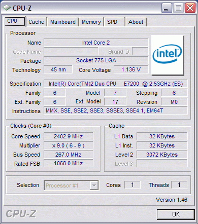 Как видите, условия можно назвать практически равными: работает только одно ядро, полностью совпадают тип, частота и тайминги памяти, частота работы ядра также идентична (для этого, в случае с платформой LGA775, нам пришлось воспользоваться способностью инженерного сэмпла Core 2 Duo E7200 менять коэффициент умножения на произвольный). И здесь у дотошных, но торопливых читателей, может возникнуть вопрос: а как кэш? Ведь у ядра Wolfdale размер L2 (который в данном случае весь достаётся одному ядру) равен 3 МБ, в то время как Agena (это ядро в тестировании представлял Phenom X4 9850 Black Edition) имеет лишь 2 МБ кэша третьего уровня.
