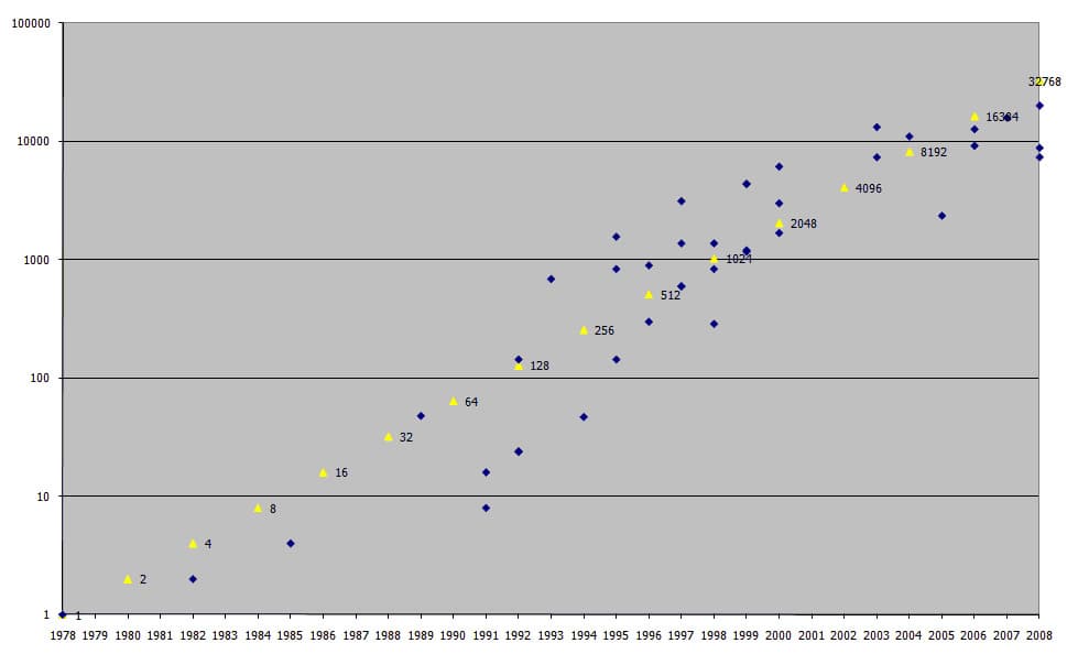 Этого господина (если кто не в курсе) зовут Гордон Мур, и известен он публике прежде всего по эмпирической закономерности имени себя (именуемой в народе «законом») об удвоении числа транзисторов в микросхеме каждые 2 года. Правда, за более чем полвека существования этого закона его успели переврать как по цифре (иногда говоря об удвоении за 1,5 года), так и по характеристике (говоря о скорости процессора, а не о числе транзисторов). И поскольку потребитель покупает не транзисторы и даже не мегагерцы, а именно производительность, предположим, что каждые 2 года удваивается именно она. А теперь проверим, что нам напредсказывал мистер Мур, и как оно соблюдалось за 30 лет существования архитектуры x86 — согласно нашей свежеиспечённой классификации по скорости: