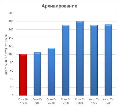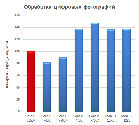 Если рассмотреть результаты тестов по отдельным логическим группам, то здесь все ожидаемо. Самая низкая производительность — у процессора Core i3-7350K, затем идут в порядке возрастания производительности процессоры Core i5-7400 и Core i5-7600K, далее три процессора Xeon E3-1275 v6, Xeon E3-1280 v6 и Core i7-7700 с равной производительностью, и, как уже отмечалось, самая высокая производительность у процессора Core i7-7700K. Исключение составляет лишь логическая группа тестов «Обработка цифровых фотографий», где у процессоров Core i5-7400 и Core i5-7600K явный провал производительности, так что результаты процессора Core i3-7350K в данной группе тестов выше.