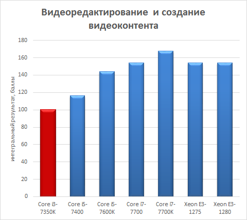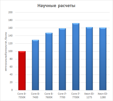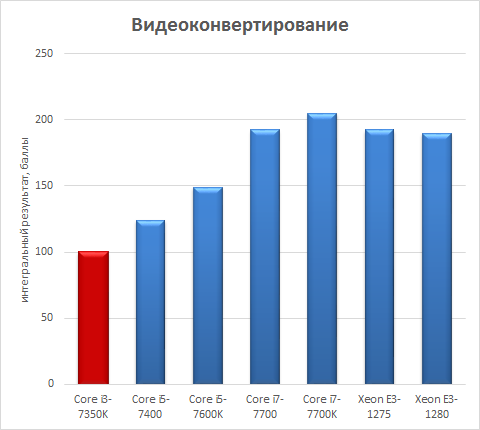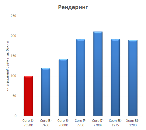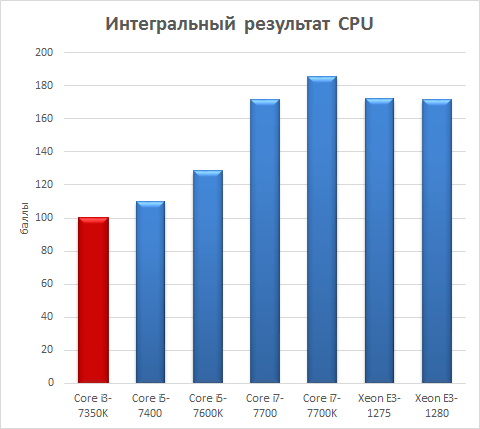 Лидером в плане производительности является процессор Intel Core i7-7700K. Он опережает по интегральному показателю производительности на 8% процессоры Xeon E3-1275 v6, Xeon E3-1280 v6 и Core i7-7700 и на 86% процессор Core i3-7350K.