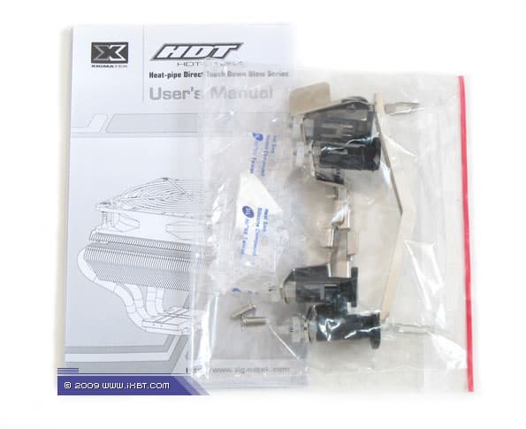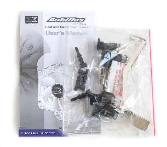После вскрытия упаковки обнаруживаем очень похожий набор причиндалов — комплект мультплатформенного крепежа (монтажные планки под LGA775 вместе с клипсой для Socket AM2), пакетик с термопастой и техническое руководство. В поставке S1284 Achilles дополнительно приложены «силиконовые» штифты (используются для смягченной и вибродемпфирующей фиксации вентилятора на радиаторе).