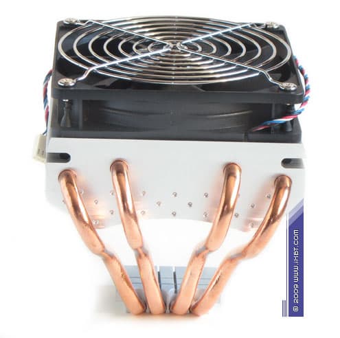 Опрятно выглядят наши подопытные и в общетехническом конфигурировании. Так, основным достоянием «рабочего тела» HDT-D1284 выступает солидная комбинация из 4 медных тепловых трубок диаметра 8 мм, «горизонтальной» секции алюминиевого оребрения (характерные размеры 124×120×45 мм, 59 пластин толщиной 0,3 мм, шаг постановки 2 мм, общая площадь поверхности теплоотдачи порядка 5500 см2) и набортного вентилятора типоразмера 120×120×25 мм (номинальная скорость вращения крыльчатки 1500 об/мин). Интересным конструктивным решением является также россыпь специализированных «пупырышков», дислоцированных в «нижнем» секторе пластин оребрения — они играют роль турбулизаторов и способствуют интенсификации теплоотдачи в условиях слабонапорных потоков (подразумеваем пониженные и, соответственно, малошумные обороты крыльчатки).