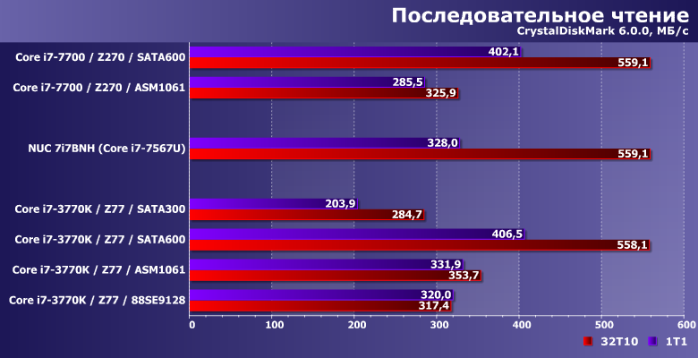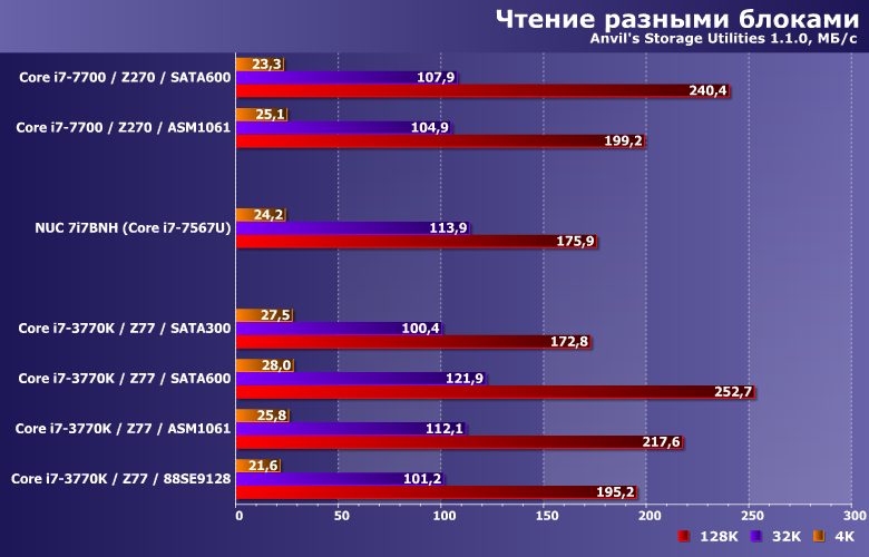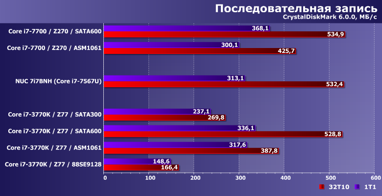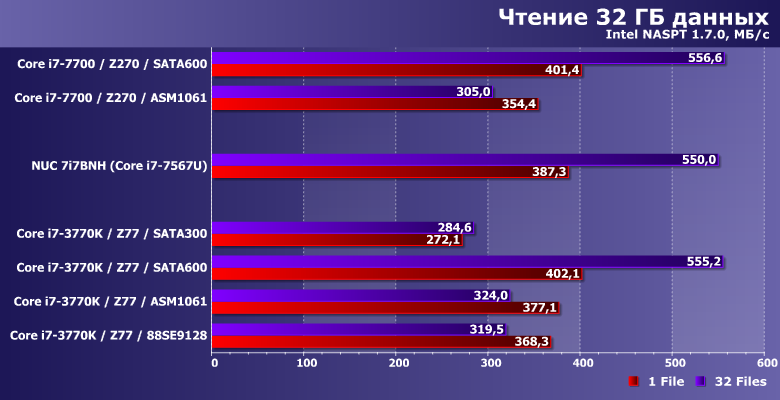 Производительность в этих сценариях никогда не достигает «потолка» SATA-интерфейса, но от его реализации зависит. Правда, также она зависит и от количества «лишних» элементов на пути данных — что всегда «бьет» по дискретным контроллерам. С учетом этого, от чипсетного SATA300 могут отставать не только разнообразные представители семейства Marvell 91хх, но и ASMedia ASM1061. В общем, еще один довод против плат расширения при отсутствии нехватки портов. А если таковая и наблюдается (что бывает редко, но не невозможно) — в пользу использования дискретных SATA-контроллеров только для подключения низкоскоростных накопителей, типа винчестеров. Правда, таковое делает как поддерживаемую версию SATA, так и интерфейс подключения к плате малозначимыми деталями, но так бывает часто.