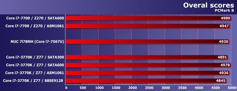 Общие оценки показывают все сказанное выше — но в сжатой форме. В частности, низкоуровневый балл существенно зависит от производительности операций со случайным доступом, а таковая от интерфейса зависит вовсе не линейно. В итоге и разница между портами одного и того же чипсета Z77 не двукратная, а лишь порядка 25%. Что характерно, отставание «старой» платформы от «новой» и при использовании одинаковой версии SATA-интерфейса составляет примерно 10% — с учетом вышесказанного, не так уж и мало. В итоге ее быстродействие оказывается ближе, скорее, к современным мобильным платформам.
