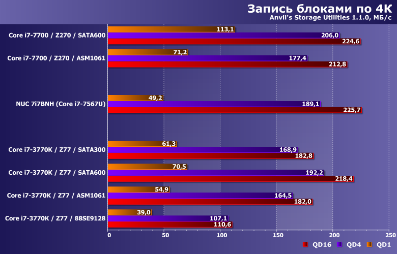 Аппаратное же обеспечение для этой статьи, естественно, поменялось. Впрочем, в качестве эталона так и осталась наша тестовая система на базе процессора Intel Core i7-7700 на плате ASRock Z270 Killer SLI (чипсет Intel Z270). Также недавно мы протестировали SSD SanDisk Ultra 3D в составе Intel NUC 7i7BNH — тоже Core i7 «седьмого» поколения, но мобильный двухъядерный, что сказывается на результатах некоторых тестов.