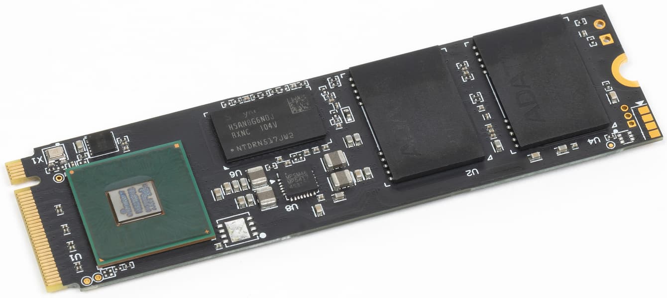 Впрочем, розничные цены — отдельный больной вопрос, способный испортить продажи любых интересных технически решений. Эта проблема пока касается и нашего героя — который в ДНС стоит, например всего на 1000 рублей дешевле, чем XPG Gammix S70 Blade (на топовом восьмиканальном IG5236), но на полторы тысячи дороже Gammix S50 Lite (на SM2267). При этом вся тройка дороже 10 тысяч — хотя бюджетный NVMe-терабайтник в настоящее время можно купить дешевле 10 (такие есть не только в ассортименте Adata). В таких условиях «компромиссы» выглядят странно — логичнее либо сэкономить больше, либо уже не волноваться, что скорости где-то «не хватит». Вот когда подешевеет — станет привлекательнее. Но протестировать можно уже сейчас — чем и займемся. Упомянув только, что здесь используется (как несложно уже догадаться) контроллер InnoGrit IG5220 и 176-слойная память Micron B47R. Последнюю Adata покупает пластинами, а нарезает и тестирует уже сама — откуда и собственная маркировка на чипах. Причем для экономии в каждом всего по четыре кристалла, хотя на деле такой терабайтник можно «упаковать» и в габариты 2230 или, как минимум, 2242: контроллер компактный, а DRAM нет. И моделей на 2+ ТБ в линейке пока нет, но выпустить их при таком подходе элементарно — места на плате под еще пару чипов заранее есть, а контроллер поддерживает до 4 ТБ.